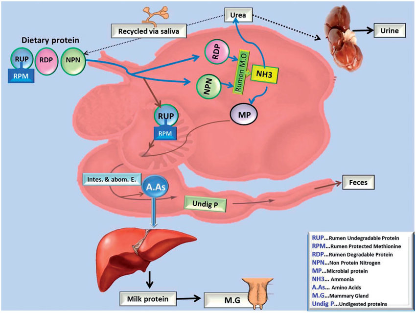 The DIP, also called Rumen Degradable Protein (RDP), represents the portion of intake crude protein (CP) that can be digested or degraded to ammonia and amino acids in the rumen by microbes. This fraction of CP consists of non-protein nitrogen (e.g., urea and ammonia in treated silage) plus the true proteins that are soluble and those having intermediate ruminal degradability. They are used to synthesize microbial protein in the rumen. The RDP or DIP is expressed as a percentage of CP, where DIP = NPN + Soluble True Protein + True Protein of Intermediate Degradability.